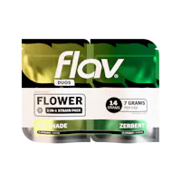 Introducing Flav Duos, the ultimate flower pairing experience designed to elevate your sesh. Each 14-gram pouch features 7-grams of complementary strains. This limited-edition Duo combines the zesty uplift of Melonade (Sativa) with the creamy, fruity balance of Zerbert (Hybrid) — delivering a terpene-rich journey from sunrise motivation to sunset chill.